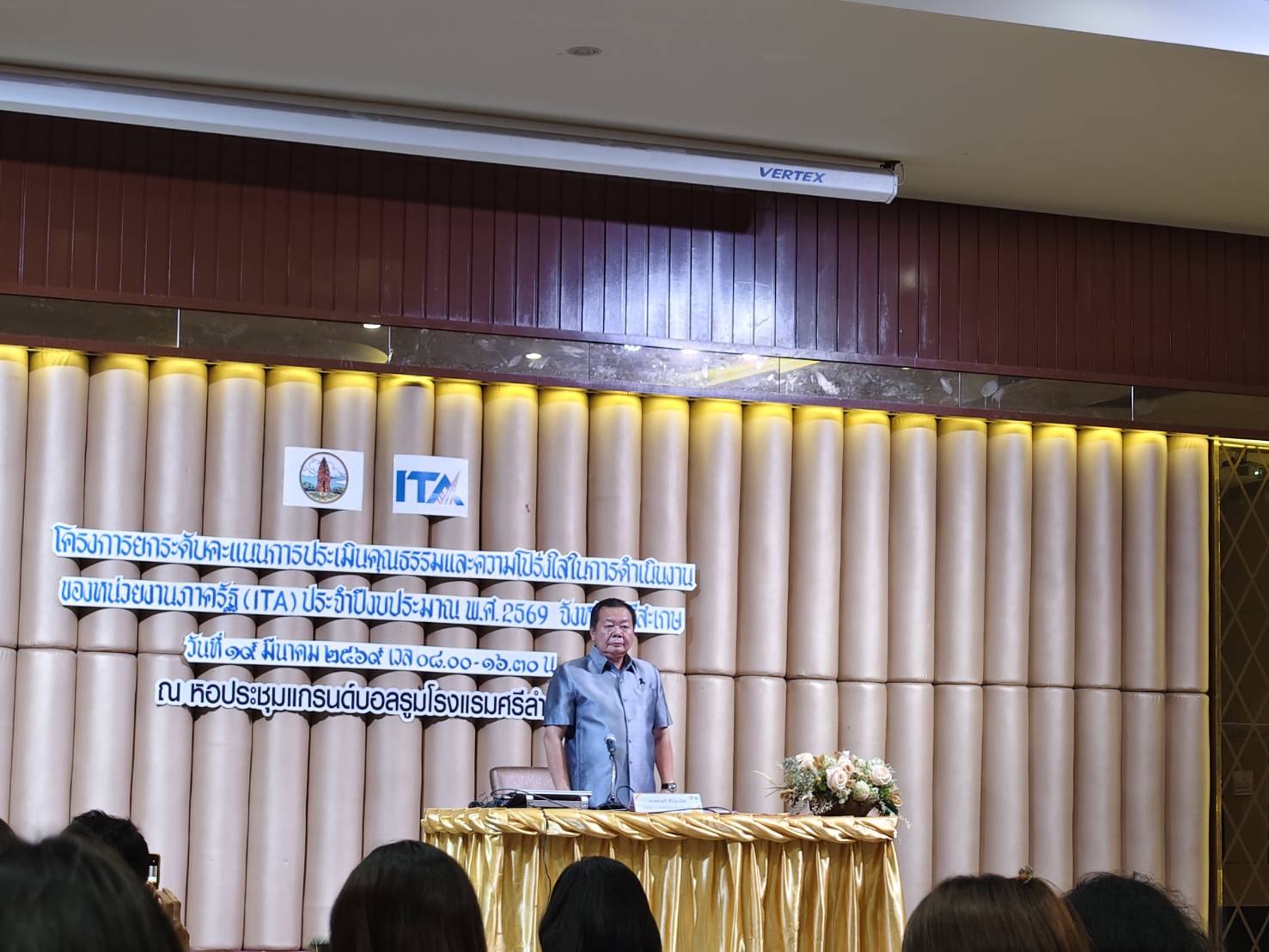 วันพฤหัสบดีที่ 19 มีนาคม 2569 เวลา 08.30 น. นายชาติศักดิ์ จันทร์สุคนธ์ อุตสาหกรรมจังหวัดศรีสะเกษ มอบหมายให้ นางสาวกาญจนา ภักดี หัวหน้ากลุ่มนโยบายและแผนงาน ร่วมอบรมโครงการขับเคลื่อนการพัฒนา และยกระดับคะแนนการประเมินคุณธรรมและความโปร่งใสในการดำเนินงานของหน่วยงานภาครัฐ (ITA) ประจำปีงบประมาณ พ.ศ. 2569 จังหวัดศรีสะเกษ ณ ห้องศรีลำดวนแกรนด์บอลรูม โรงแรมศรีลำดวน อำเภอเมืองศรีสะเกษ จังหวัดศรีสะเกษ โดยมี นายธาตรี สิริรุ่งวนิช รองผู้ว่าราชการจังหวัดศรีสะเกษ เป็นประธานในพิธิเปิดการอบรม